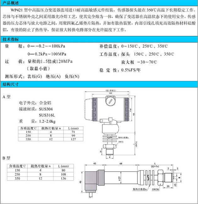 wp421型中高溫壓力變送器選用進Kou耐高溫敏感元件組裝,傳感器探頭能在350C高溫下長期穩(wěn)定工作。